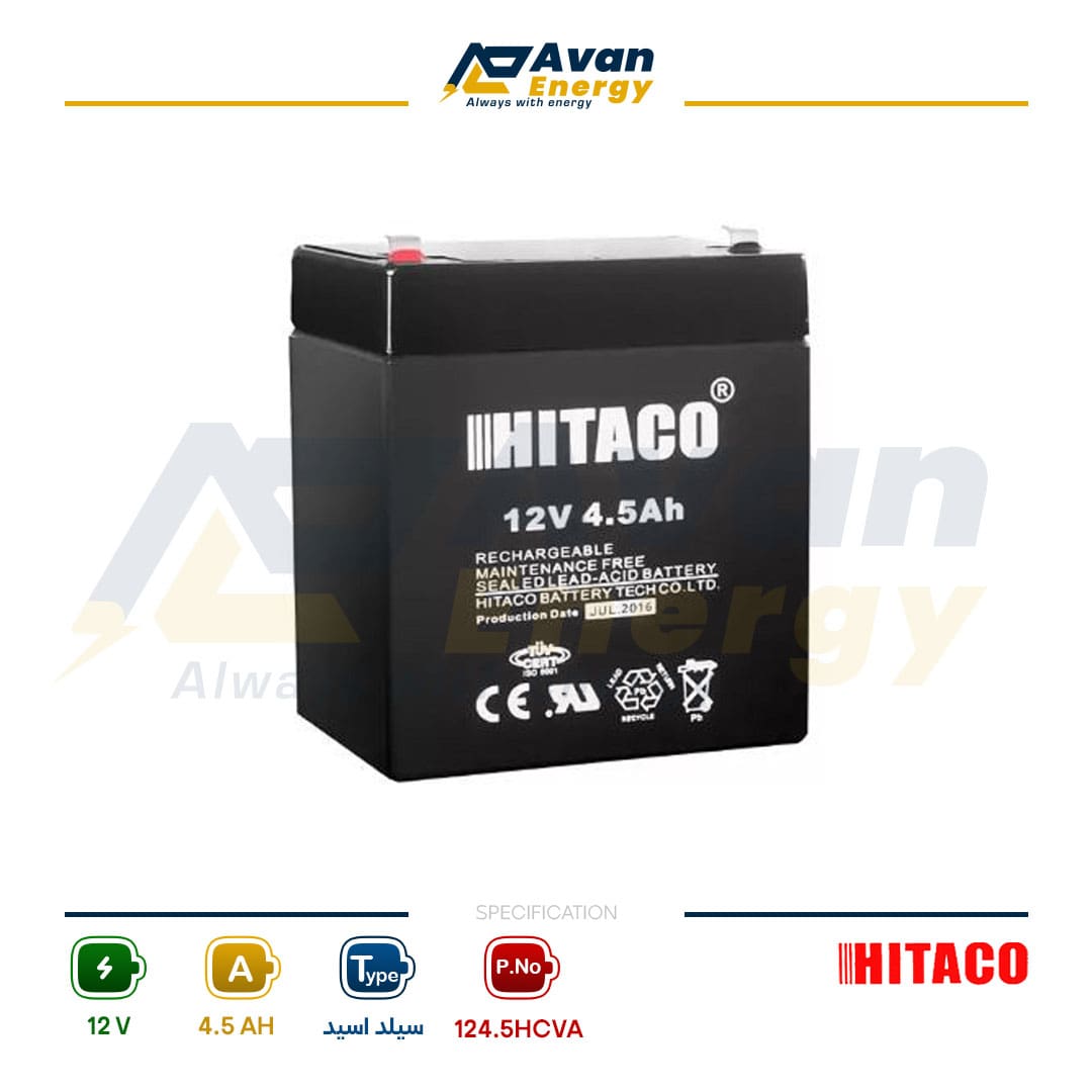 باتری 12 ولت 4.5 آمپر ساعت هیتاکو از نوع سیلد لید اسید باتری خشک قابل شارژ می باشد. باتری هیتاکو ساخت ایران می باشد و در موارد زیر کاربرد دارد: باتری آسانسور، باتری یو پی اس، سانترال، سولار (سیستم های خورشیدی)، باتری تجهیزات پزشکی، ماشین شارژی، موتور شارژی، سیستم های اعلام حریق، باتری مدار فرمان دربهای اتوماتیک و باتری تجهیزات مخابراتی، شبکه های کامپیوتری، ATM، دزدگیر و … .