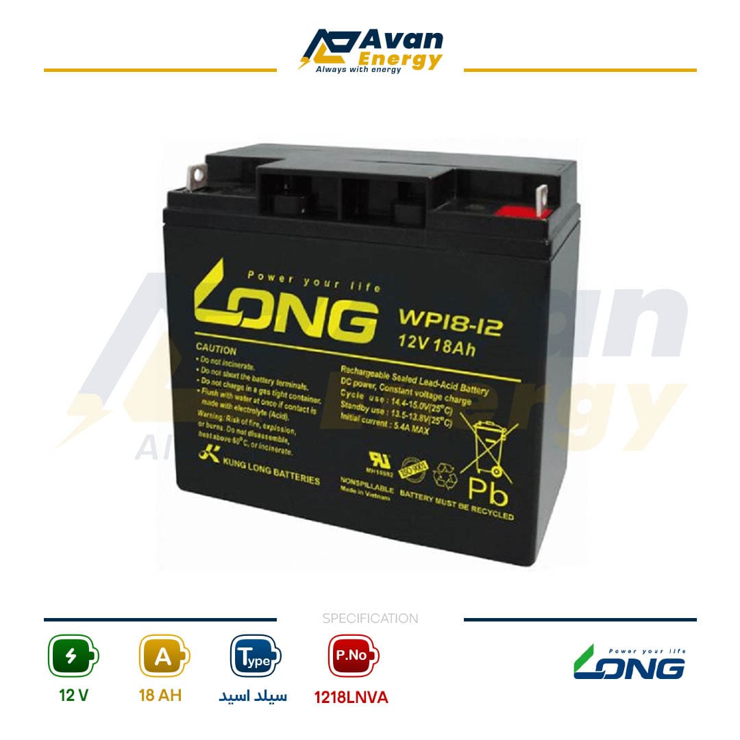 باتری 12 ولت 18 آمپر ساعت لانگ از نوع سیلد لید اسید باتری خشک قابل شارژ می باشد. باتری لانگ ساخت ویتنام می باشد و در موارد زیر کاربرد دارد: باتری آسانسور، باتری یو پی اس، سانترال، سولار (سیستم های خورشیدی)، باتری تجهیزات پزشکی، ماشین شارژی، موتور شارژی، سیستم های اعلام حریق، باتری مدار فرمان دربهای اتوماتیک و باتری تجهیزات مخابراتی، شبکه های کامپیوتری، ATM، دزدگیر و دستگاه کفشور، ویلچر، دوربین مداربسته و … .